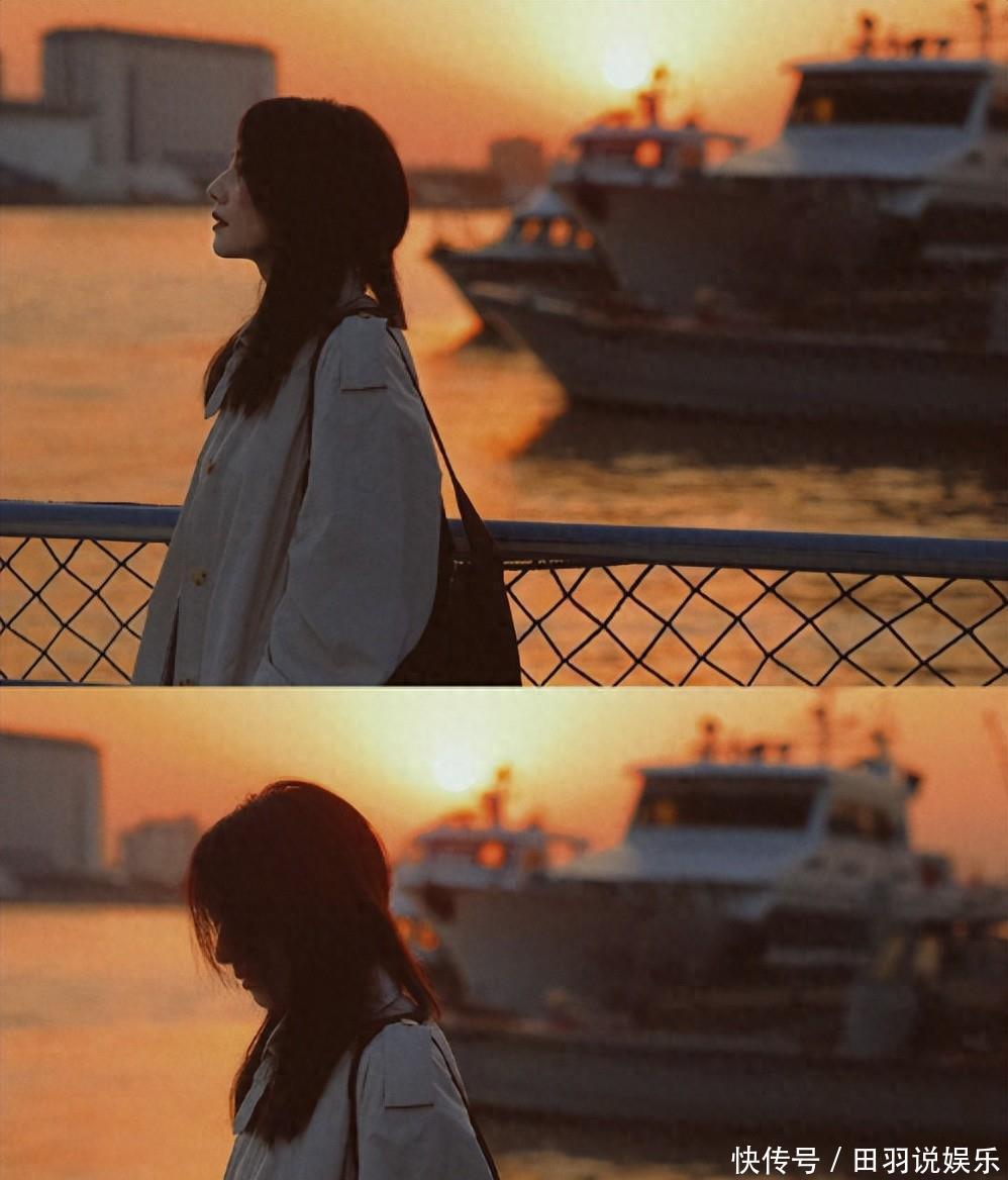 暖光从后面洒下来,把她的轮廓勾得温柔又立体,皮肤在夕阳下几乎透明,零死角。