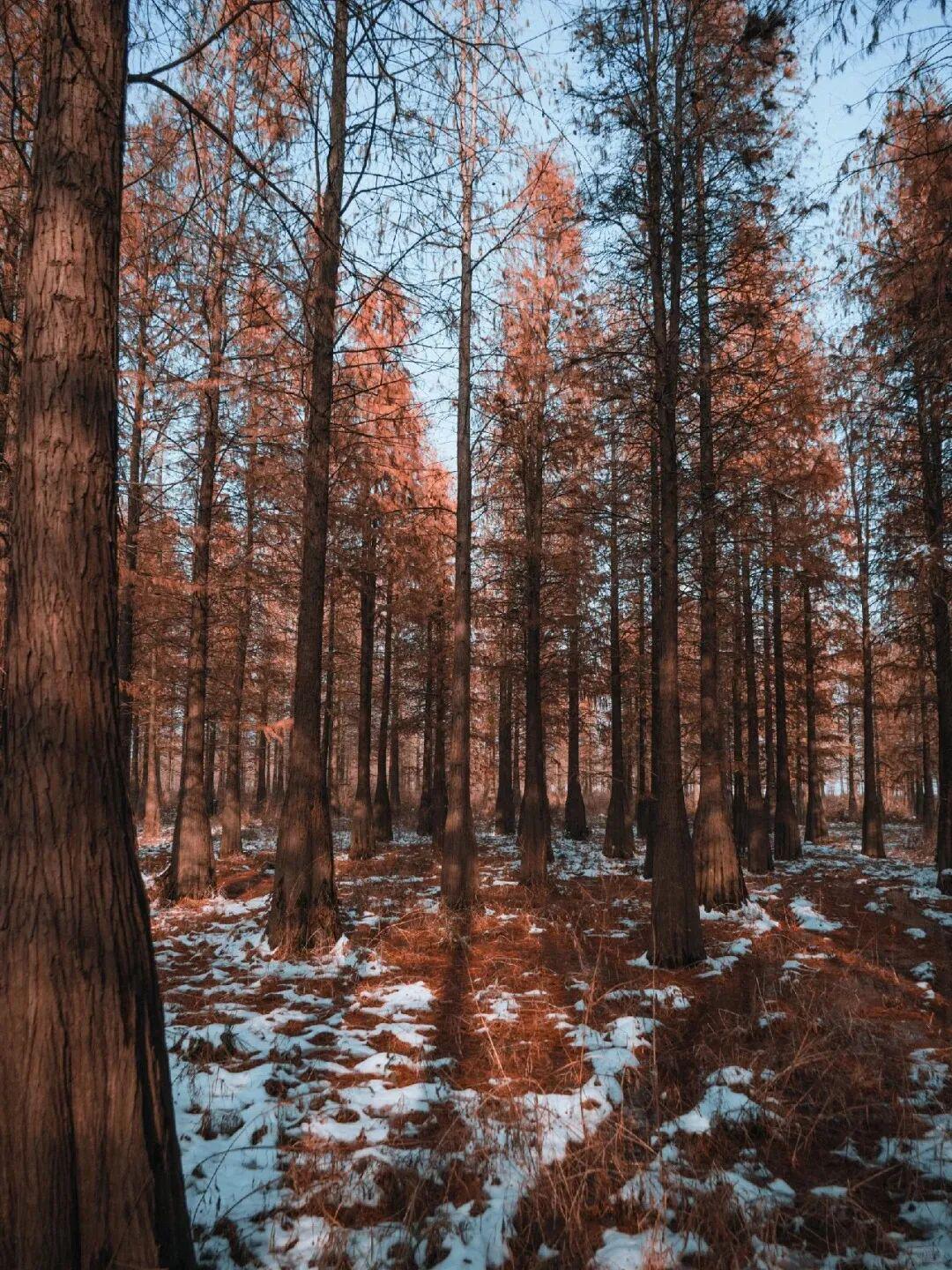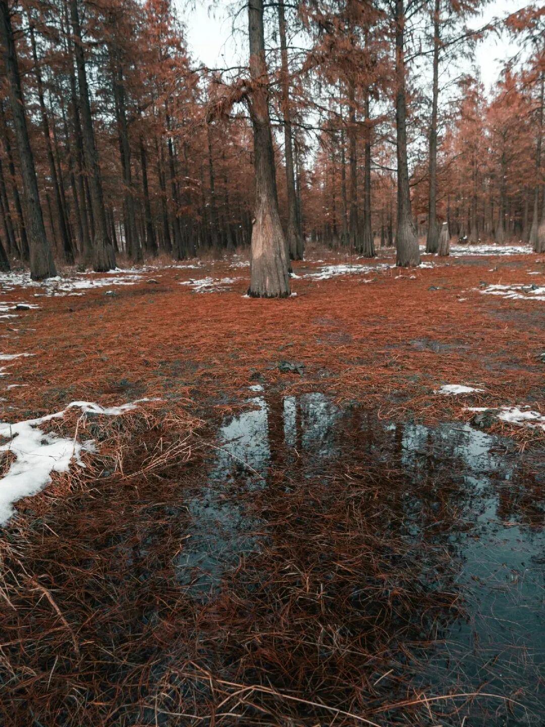 如果说枫叶是暮秋的星星,那红杉便是初冬的调色盘。千亩池杉层层叠叠晕染在水边,薄雾未散时,红杉的影子映在平静的水面,分不清是树在水里,还是水在树上,12月至次年1月来,这里人流量少,身处其中像拥有整片秘境。