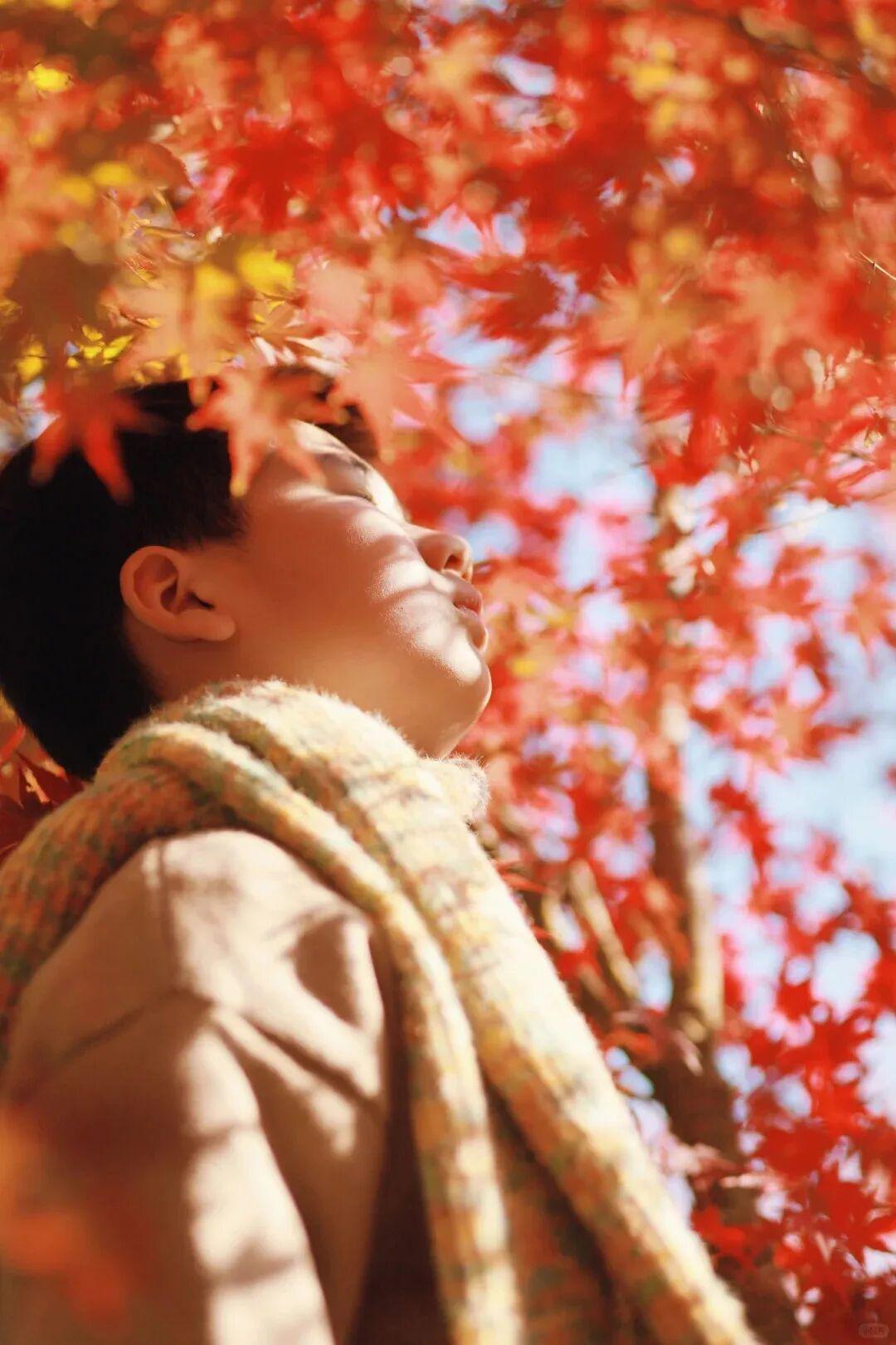 将红叶置于镜头边缘,对焦人物,让红叶虚化出朦胧的框,层次感瞬间就有了~