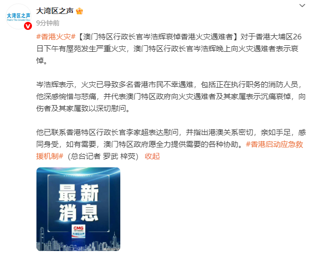 实盘配资网站 澳门特区行政长官岑浩辉哀悼香港火灾遇难者
