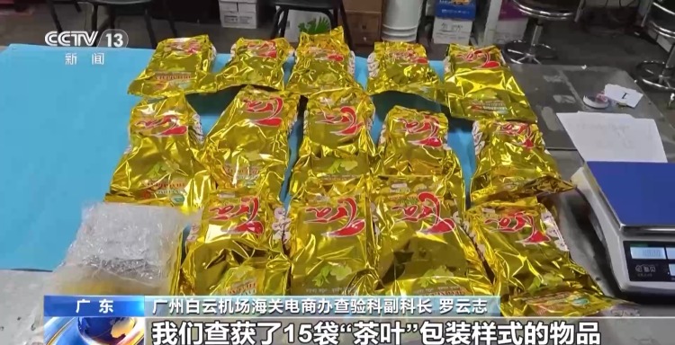 广州白云机场海关电商办查验科副科长 罗云志:我们从X光机的过机图像可以很明显地看到,货物里是一包一包小体积的袋装物品,袋装物品内有大量团状物,与常见的茶叶图像不符。我们当即决定对这票货物进行进一步查验,开拆外包装后,我们查获了15袋“茶叶”包装样式的物品,每袋600克左右。拆开这些“茶叶”的外包装后,里面是一整袋真空包装的绿色植物碎屑,一打开就可以闻到浓烈的刺鼻气味。