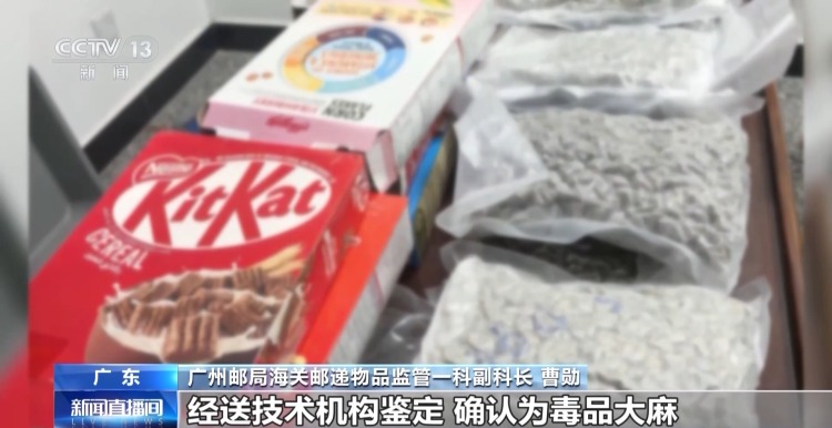 广州邮局海关邮递物品监管一科副科长 曹勋:拦截查验后,我们在旅客的行李箱及手提袋内发现多盒包装完好的零食。拆开零食包装后,发现里面是真空密封包装的绿色团状植物,伴有强烈的刺鼻气味,现场试剂检测呈大麻阳性反应。经送技术机构鉴定,确认为毒品大麻,重3735克。