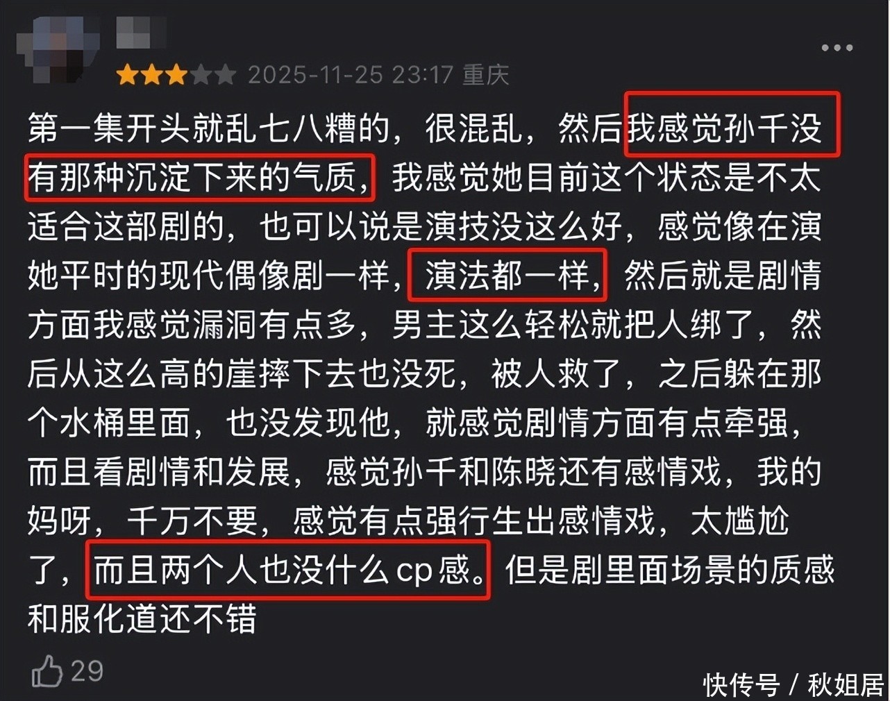 38. 并非全盘否定孙千的能力。她在现代剧中展现的灵气与青春感,观众有目共睹。但来到年代剧语境,显然未能完成转型。
