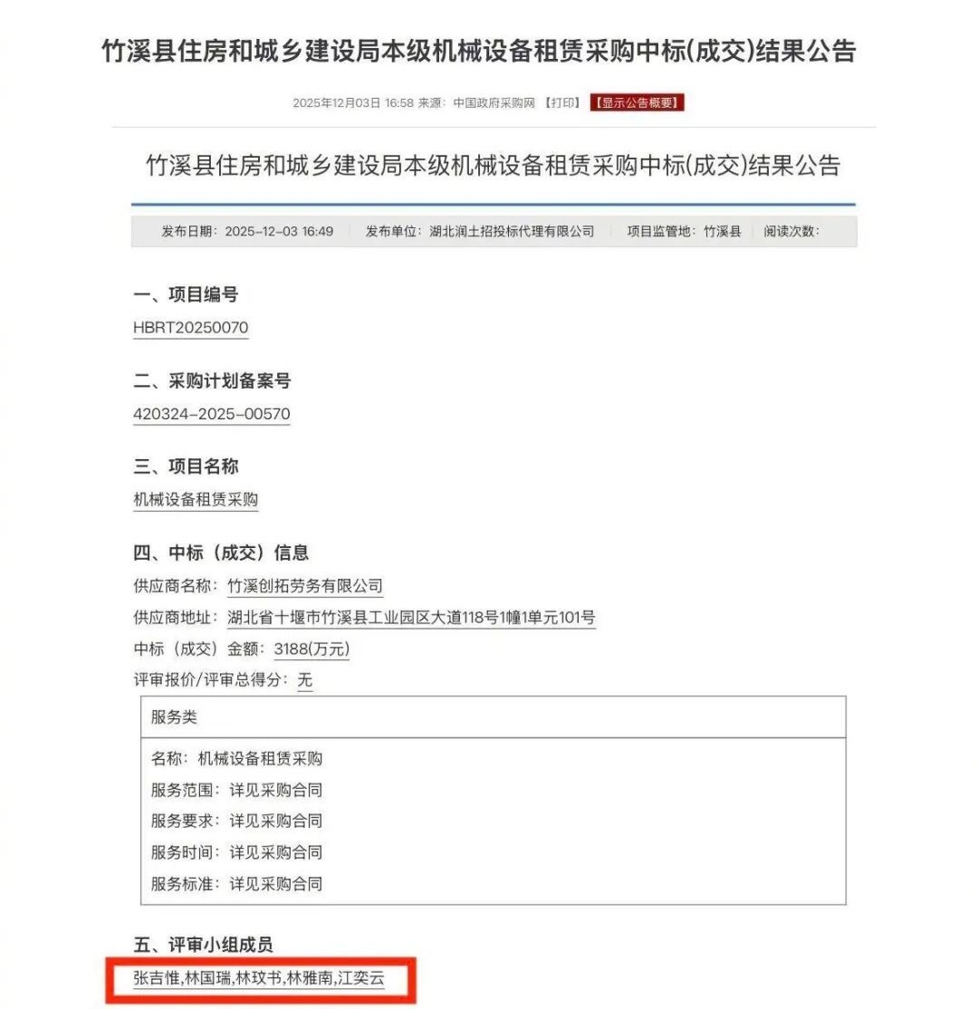 还有更离谱的,湖北竹溪县住建局,3188万的设备租赁采购项目,程序合规得很,但细看之下,评审小组名单居然与百度文库的“10000 中国普通人名大全”前面一些名字几乎完全“撞衫”了,这就奇了怪了。