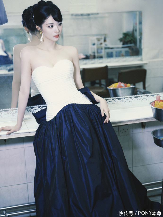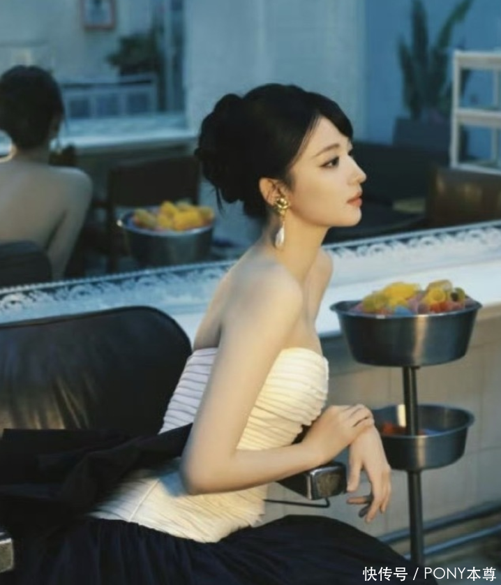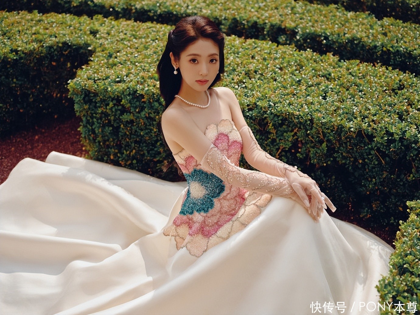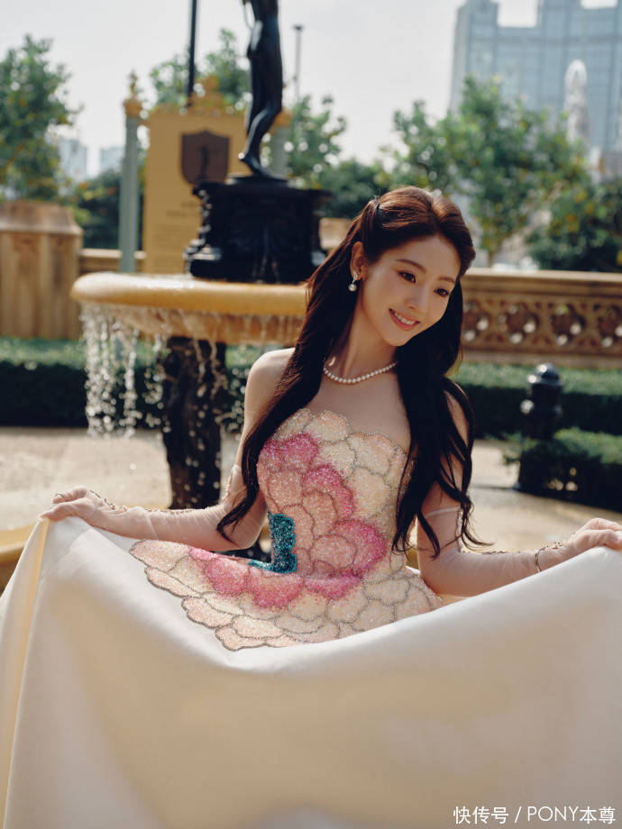 裙身的珍珠元素并非堆砌,而是巧妙地分布在抹胸边缘和裙身,与王楚然的冷白皮肤形成天然呼应,光泽感恰到好处,既凸显了 “富贵千金” 的奢华感,又不会显得浮夸。