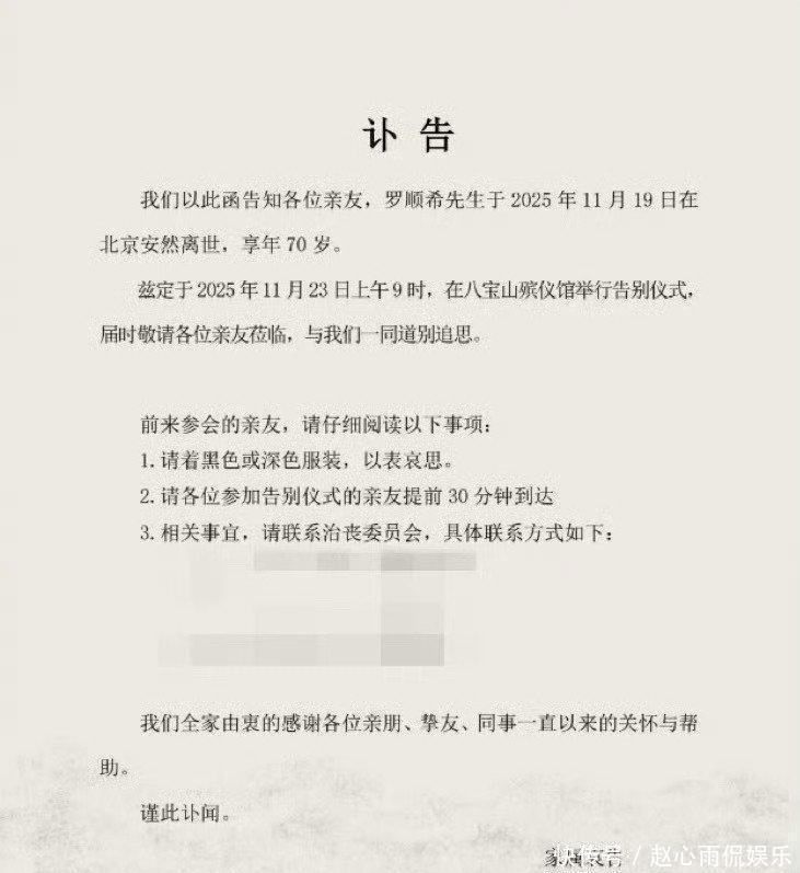 11月23日这天,根据发布的讣告信息,罗晋父亲的遗体告别仪式定在了今早九点。