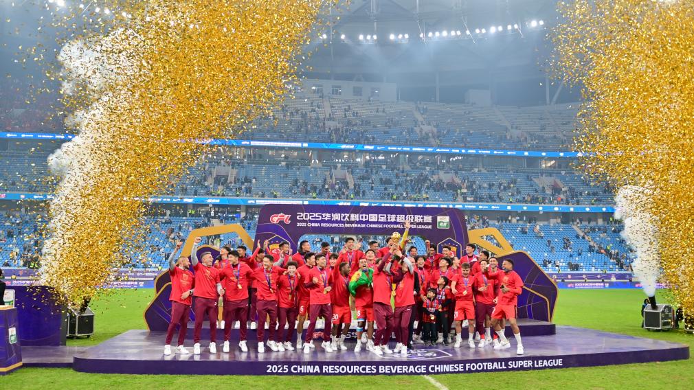 11月22日,在辽宁大连举行的2025赛季中国足球协会超级联赛第30轮比赛中,上海海港队客场1:0战胜大连英博队,获得本赛季中超联赛冠军。新华社记者吴青昊摄