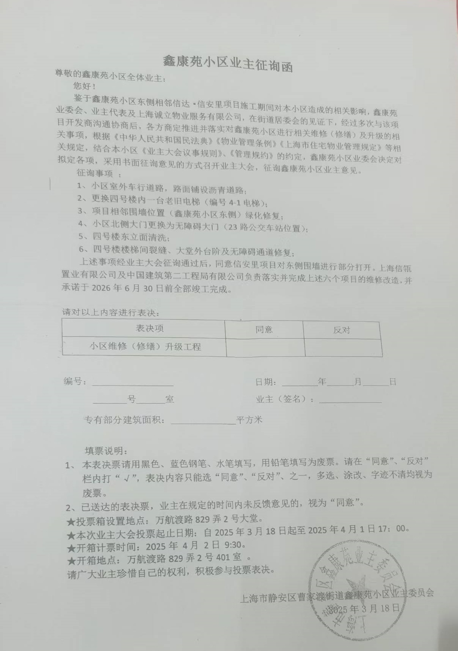 今年3月,鑫康苑发起了一项全体业主征询,起因是旁边的信安里项目施工期间对小区造成了一些影响,拟进行相关维修(修缮)。征询内容包括6项:更换4号楼内一台老旧电梯;4号楼东侧与信安里相邻围墙位置的绿化修复;4号楼东立面清洗;4号楼楼梯间裂缝、大堂外台阶及无障碍通道修复等。