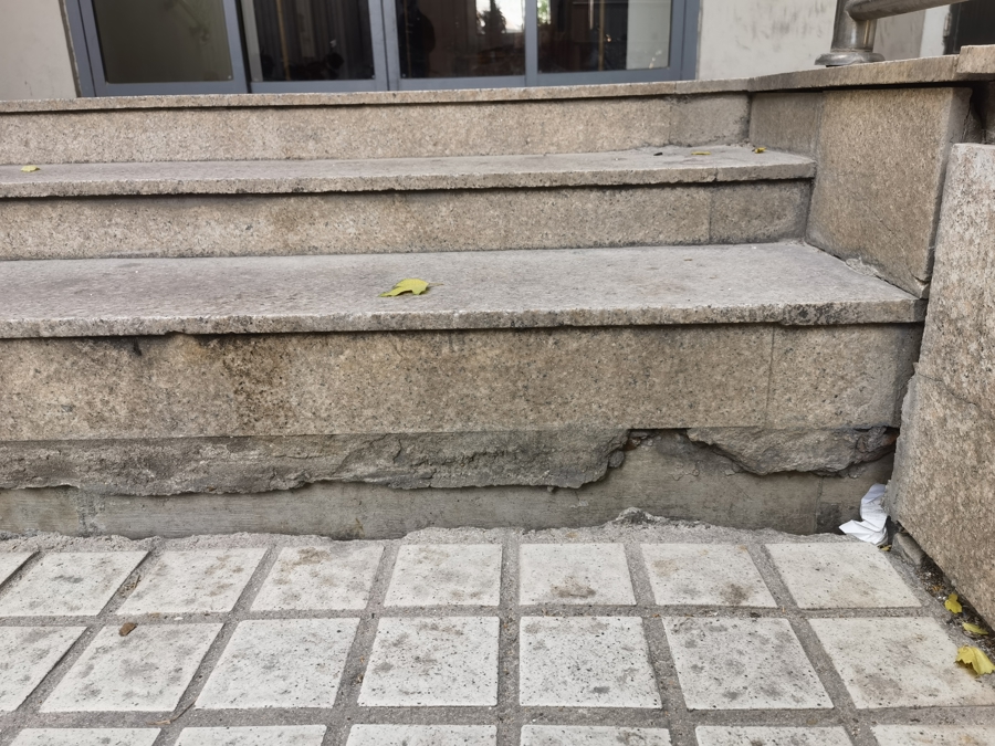 台阶旁边的无障碍通道,部分坡面不平,大理石贴面碎裂,坡面与墙面的衔接处也有沉降痕迹。无障碍斜坡通道的一处转角,有一个类似高台的过渡区(高度与3级台阶等高),侧面大理石碎裂、脱开,并出现了较大裂缝。