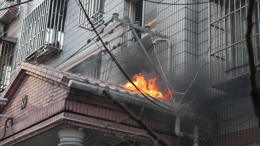 当天一早,该局执法员前往西沙海战烈士遗属李阿姨家中看望慰问,车行至老人居住的长宁区仙霞路某小区门口时,发现距离大门最近的39号居民楼二楼浓烟滚滚、火光闪烁。起火处是楼栋门上方的电缆,火势已从二楼平台窜至三楼。