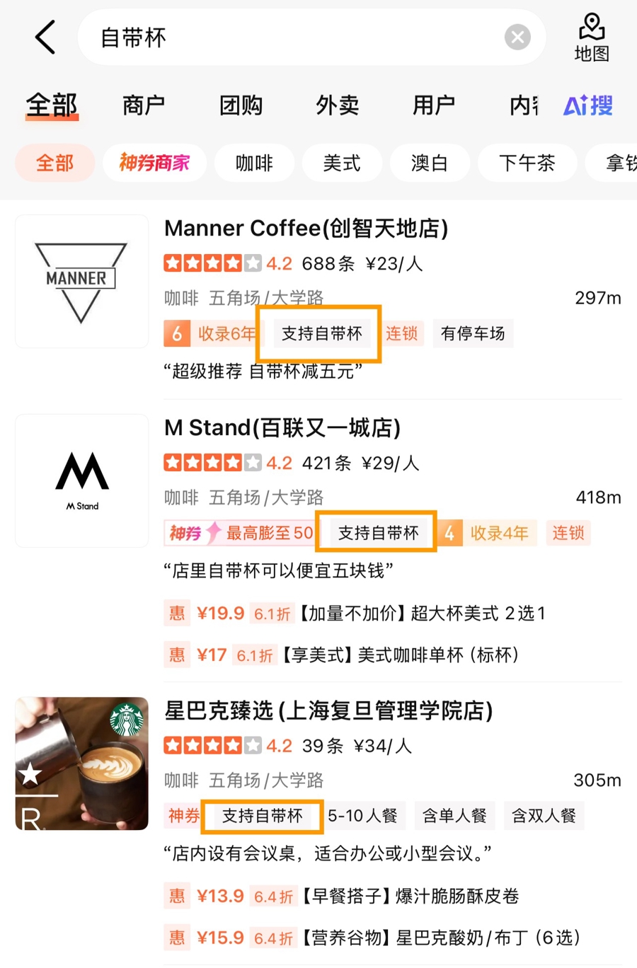 据了解,在本次行动中,Peet's Coffee皮爷咖啡、COSTA、挪瓦咖啡等连锁品牌将新增上线“支持自带杯”标签,Tims天好咖啡数百家门店参与自带杯免费试活动,宝珠奶酪新增支持多种型号自带杯及减价优惠,冰淇淋特色门店一勺米饭除标签外新增9折优惠。