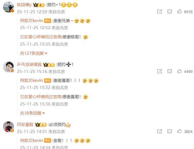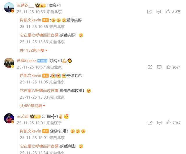 但是,后来的评论逐渐引发大家的热议,因为几乎现役的半个乒乓球圈的大佬都来了。王楚钦率先来捧场,他留言“预约+1”,之后肖凯文回复“爱你头哥”;接着正规配资十大排名,肖战来给自己的儿子捧场,他留言“订阅+1”,肖凯文回复“爱你老爸”;后面紧挨着是王艺迪,她留言“订阅+1”,肖凯文回复“谢谢迪姐”;再后面是蒯曼,她留言“订阅+1”,肖凯文回复“谢谢蒯曼”……