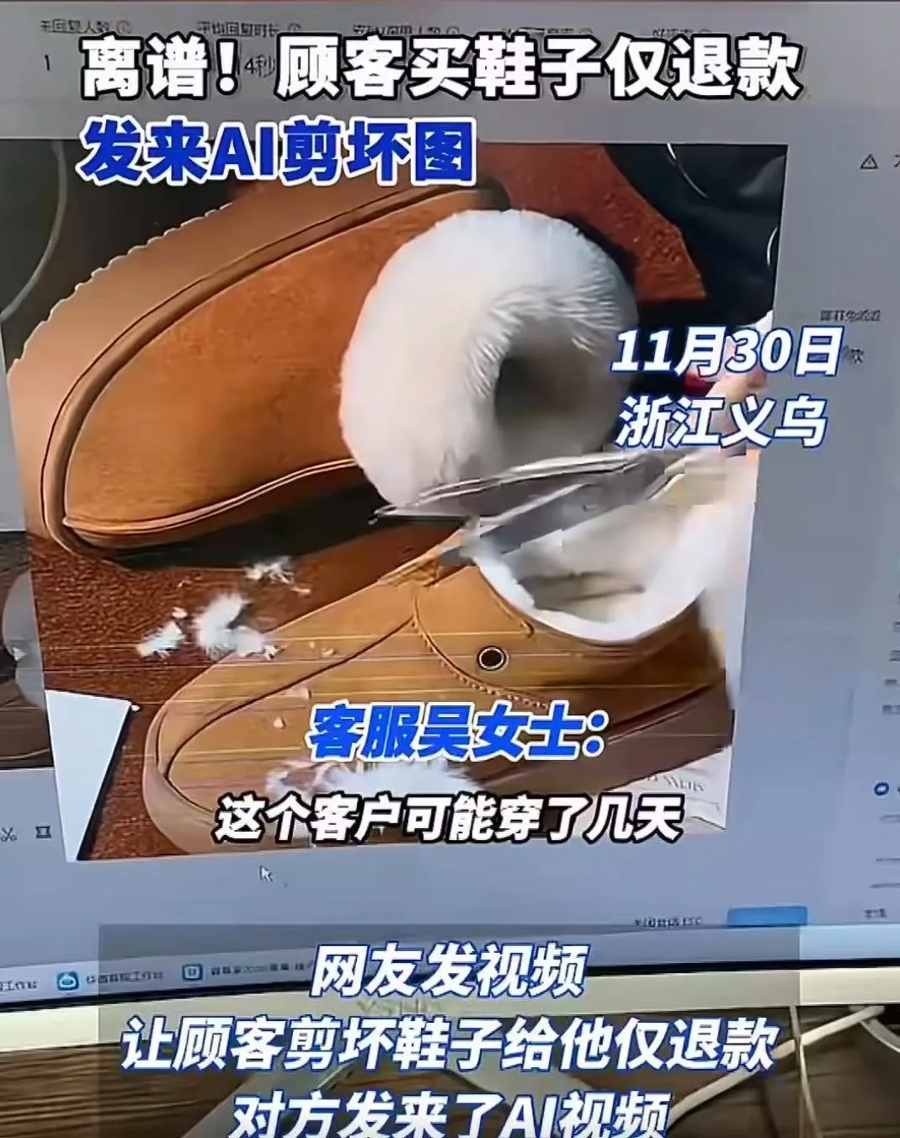 比如前不久,浙江一顾客网购鞋后申请仅退款,商家要求剪坏鞋子才给退。顾客竟用AI将商品图P成被剪坏的样子,提交给平台。