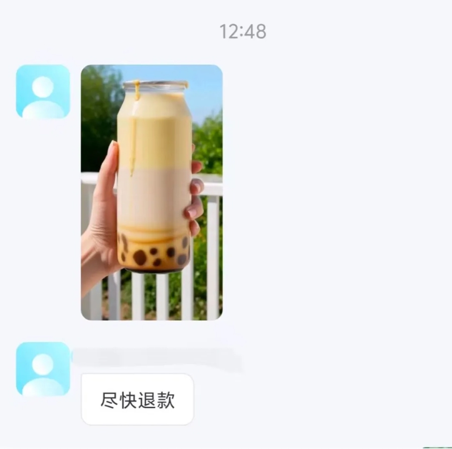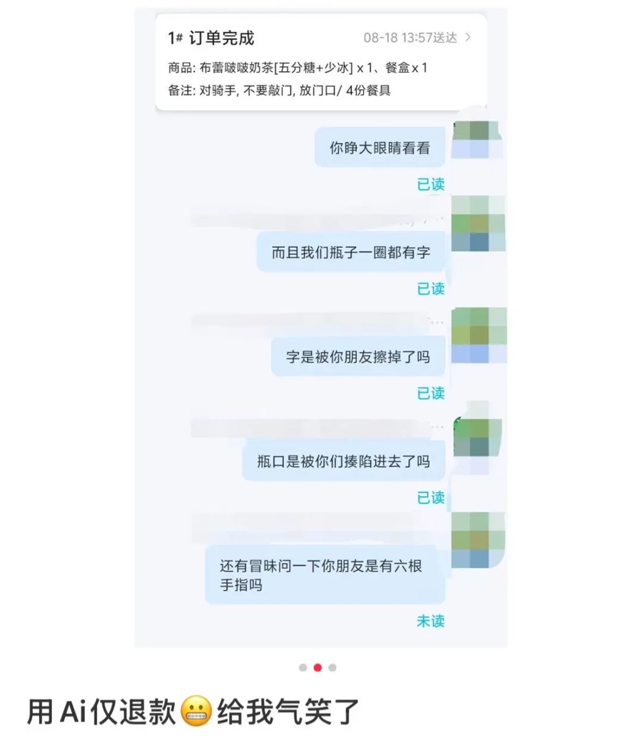 此外,某外卖平台一位商家发社交平台吐槽:一位买家提供的退款截图里,捏着饮料瓶瓶身的手指竟然有6根。因为生成的图片过于离谱,商家都忍不住当场戳穿。