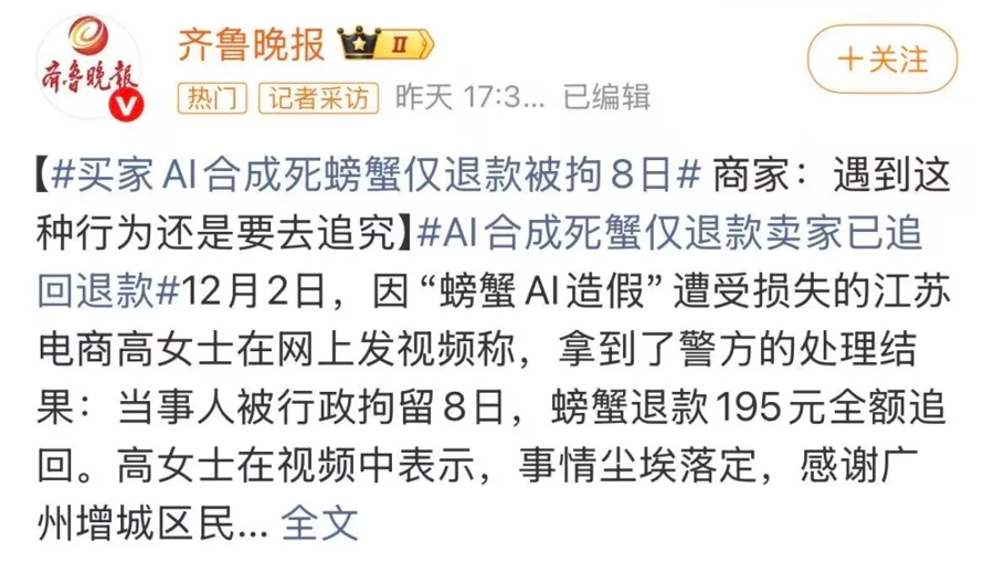 广东一位买家网购了8只大闸蟹,用AI合成假视频声称死了6只,成功骗走195元退款。商家后续核查时发现,视频里死蟹的公母数量前后矛盾,报警后涉事买家被行政拘留8日,违法所得也被全额追缴。