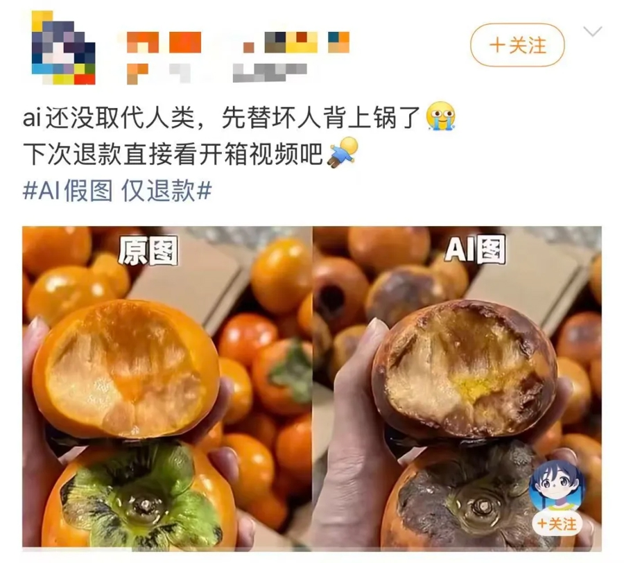 还有水果商家吐槽:我们发的都是新鲜青果,买家发来的“腐烂图”一看就是AI做的,霉斑颜色发灰,边缘还模糊不清。