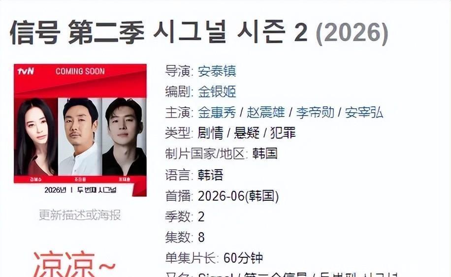 《信号2》已于今年8月杀青,金惠秀、李帝勋、赵震雄原班人马回归。