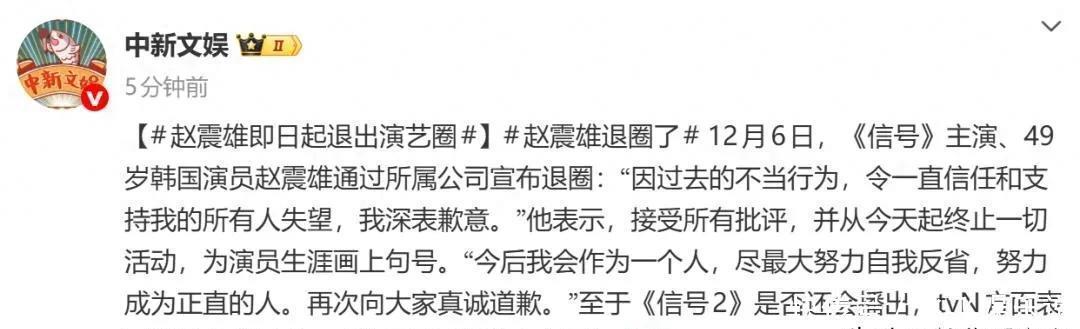 2025年12月6日,赵震雄通过经纪公司发布退圈声明: